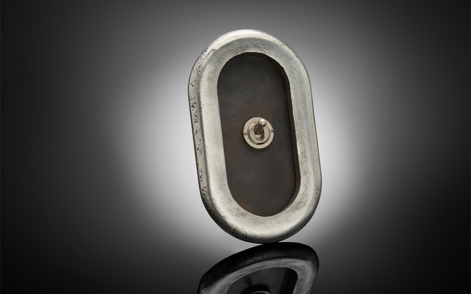 The Dual-Finish Race Track switch plate is defined by a simple racetrack outer body and a separately finished brass backplate with concealed fasteners. Cast in aluminium and hand-finished with a rustic, textured appearance, it explores material and tactile contrasts within a simple, elegant form.