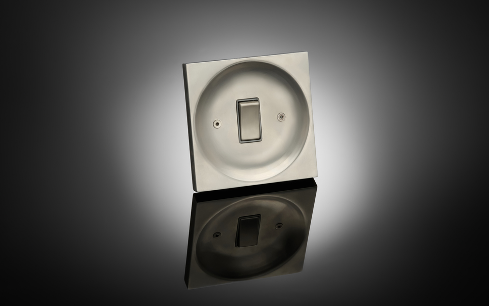 The Square Dish. A Bauhaus-inspired switch plate featuring a sharp square outer form contrasted by a smooth concave cut-out and exposed fasteners. Machined from solid aluminium and hand-finished with a modern brushed texture, it balances precision and craftsmanship, embodying the Bauhaus ideals of functional beauty and honest material expression in a refined, contemporary form.